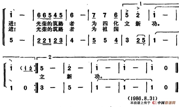 筑路工人进行曲合唱谱该歌谱演奏者为胡俊成,歌曲名称为筑路工人进行曲,歌谱类型为合唱谱。选自《胡俊成歌曲选》