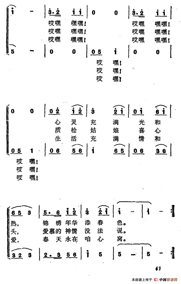 春天永在咱心窝合唱谱该歌谱演奏者为陈洛,歌曲名称为春天永在咱心窝,歌谱类型为合唱谱。合唱是包含着同声的、混声的齐声、轮声、领唱、重唱以及和声的、支声的、复调的、有伴奏或无伴奏的一种集体歌唱艺术。常见的合唱有同声合唱(男声、女声、童声),混声合唱(男声与女声、童声与男女声),演唱形式有齐唱、轮唱、二部、三部、四部等合唱、无伴奏合唱。合唱有声域更宽、气息更长、力度更大、音色更多的特点。好的合唱应该是均衡而协调。合唱的均衡取决于声音的音量、音色的平衡。合唱的协调取决于声音的谐和、音准。混声合唱一般为男女声部混合,如女高音SOPRANO,女低音ALTO,男高音TENORE,男低音BASS。女高音:明朗、轻柔、柔和。女低音:充沛、坚实而圆润。男高音:柔和、明朗、清晰、坚实。 男低音:坚实、有力、充沛而宽厚。