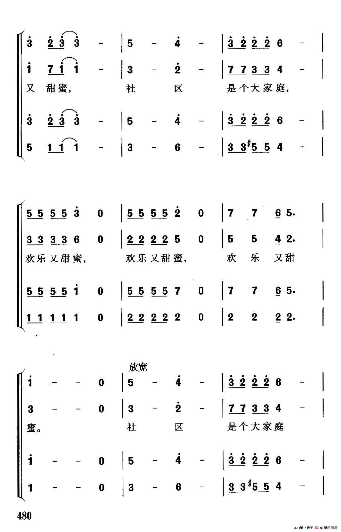 由女高音声部、女低音声部、男高音声部和男低音声部四个基本声部组成的合唱为混声合唱。每个基本声部可分为第一、第二两个分声部。
