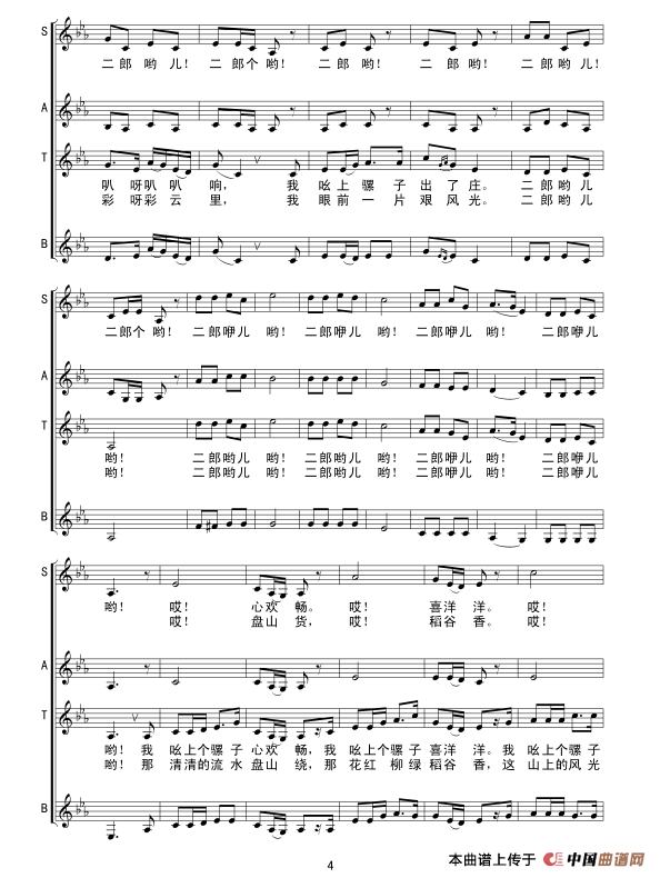 :吆骡子合唱谱该歌谱演奏者为程光华,歌曲名称为吆骡子,歌谱类型为。合唱(hé chàng)chorus指集体演唱多声部声乐作品的艺术门类,常有指挥,可有伴奏或无伴奏。它要求单一声部音的高度统一,要求声部之间旋律的和谐,是普及性最强、参与面最广的音乐演出形式之一。人声作为合唱艺术的表现工具,有着其独特的优越性,能够最直接地表达音乐作品中的思想情感,激发听众的情感共鸣。声部的数量没有规定,一般有四个声部。多为男高音区,男中低音区,女高音区,女中低音区。