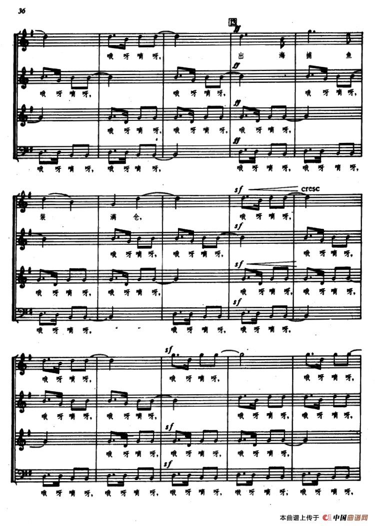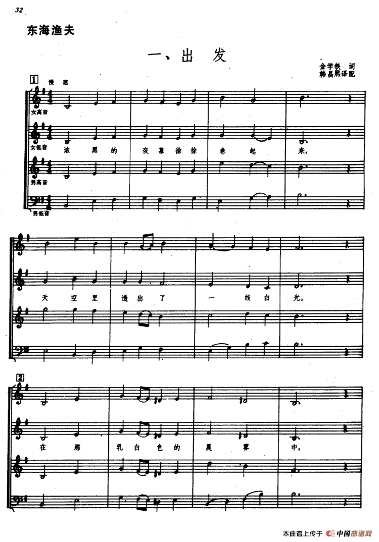 东海渔夫一、出发(五线谱)合唱谱该歌谱演奏者为郑律成,歌曲名称为东海渔夫一、出发,歌谱类型为合唱谱。选自《郑律成歌曲选》