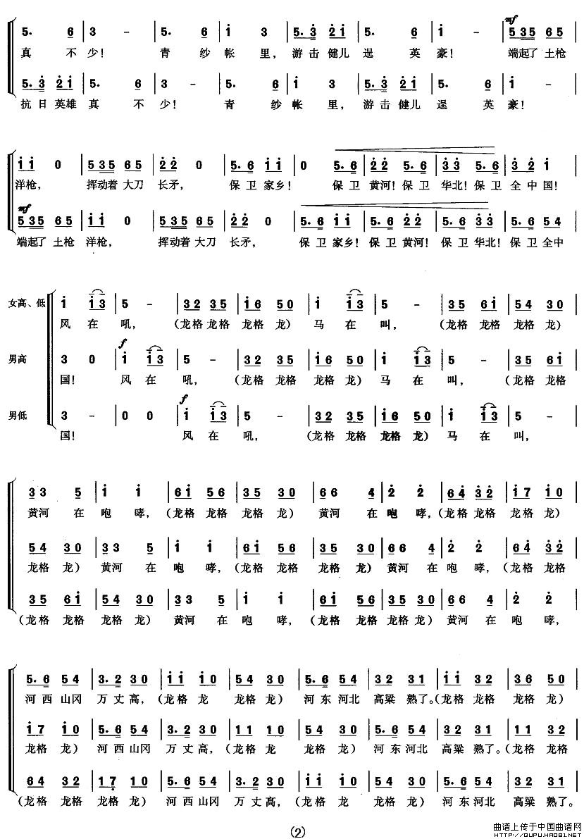 歌曲一,四部分合唱,二、三部分轮唱,此起彼伏,一浪高过一浪,恰似黄河的波涛滚滚奔流,势不可挡。轮唱时“龙格龙格”的人声伴唱,听来变化无穷,情趣横生,增强了生动、活跃、乐观的气氛。巧妙地隐喻了抗日武装队伍由小到大、由弱到强,终于汇成了一支不可战胜的力量。它将压倒一切敌人,显示了英雄民族的伟大气魄。轮唱之后的一大段器乐间奏,不仅渲染了气氛,刻画了形象,又为结束段转向高潮作好了铺垫,使结束段更凸显了中国人民誓将侵略者消灭干净的坚强决心。