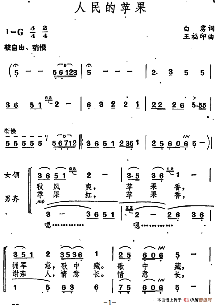 人民的苹果合唱谱该歌谱演奏者为王福印,歌曲名称为人民的苹果,歌谱类型为合唱谱。集体演唱多声部声乐作品的艺术门类,常有指挥,可有伴奏或无伴奏。它要求单一声部音的高度统一,要求声部之间旋律的和谐,是普及性最强、参与面最广的音乐演出形式之一。人声作为合唱艺术的表现工具,有着其独特的优越性,能够最直接地表达音乐作品中的思想情感,激发听众的情感共鸣。声部的数量没有规定,一般有四个声部。多为男高音区,男中低音区,女高音区,女中低音区。