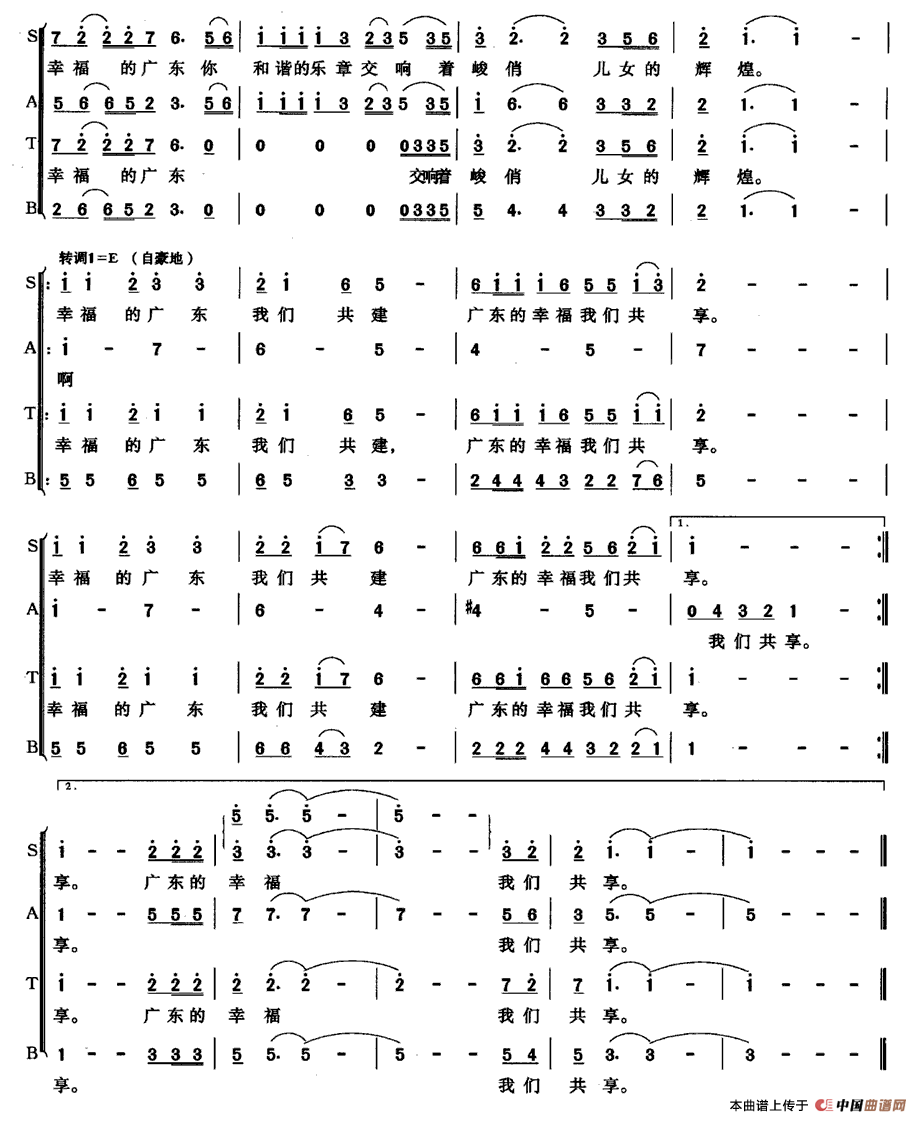 幸福广东之歌合唱谱该歌谱演奏者为高建华 ,歌曲名称为幸福广东之歌,歌谱类型为合唱谱。集体演唱多声部声乐作品的艺术门类,常有指挥,可有伴奏或无伴奏。它要求单一声部音的高度统一,要求声部之间旋律的和谐,是普及性最强、参与面最广的音乐演出形式之一。人声作为合唱艺术的表现工具,有着其独特的优越性,能够最直接地表达音乐作品中的思想情感,激发听众的情感共鸣。声部的数量没有规定,一般有四个声部。多为男高音区,男中低音区,女高音区,女中低音区。