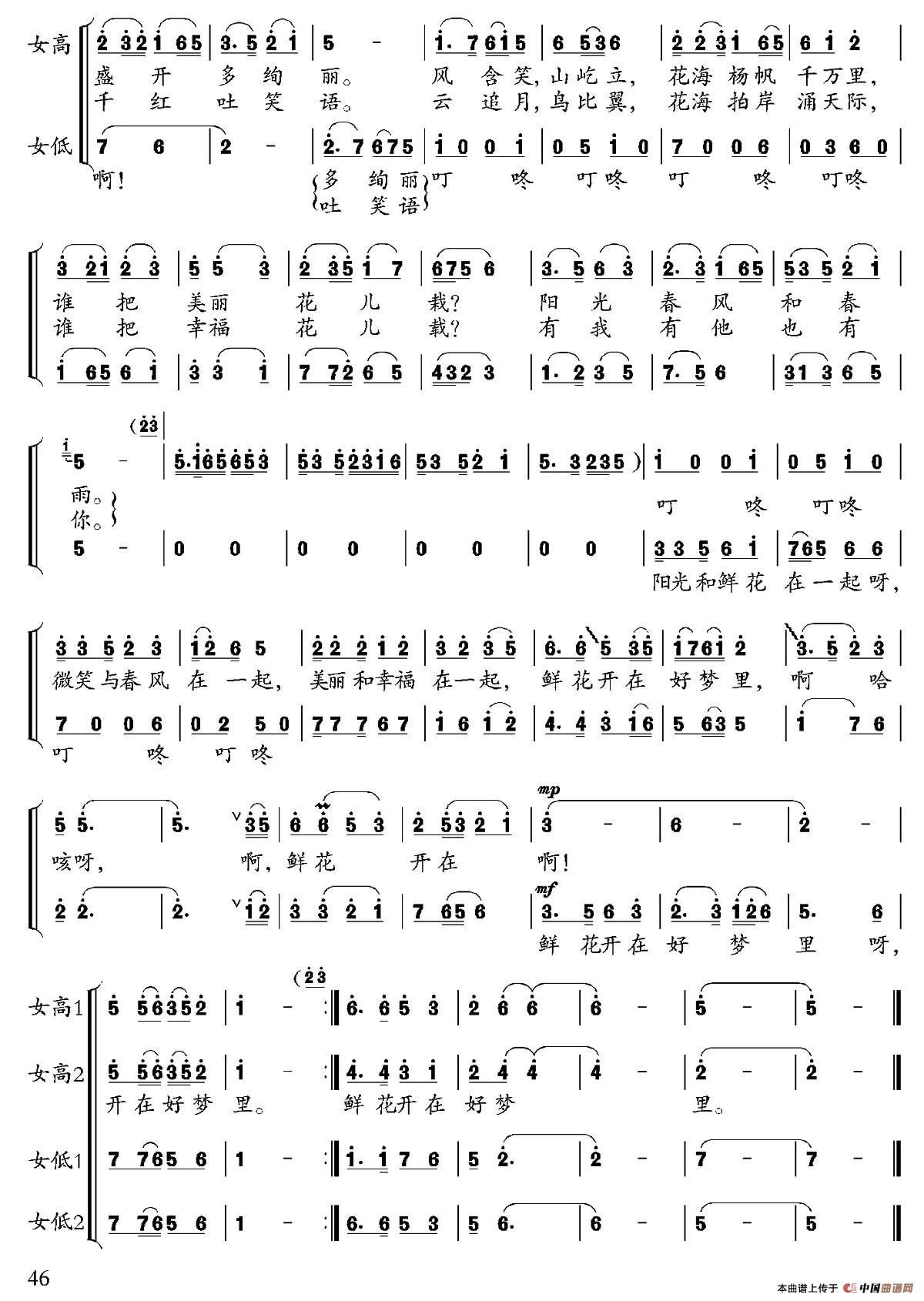 鲜花开在好梦里(赵明仁词 周源曲)合唱谱该歌谱演奏者为周源,歌曲名称为鲜花开在好梦里,歌谱类型为合唱谱。合唱(hé chàng)chorus指集体演唱多声部声乐作品的艺术门类,常有指挥,可有伴奏或无伴奏。它要求单一声部音的高度统一,要求声部之间旋律的和谐,是普及性最强、参与面最广的音乐演出形式之一。人声作为合唱艺术的表现工具,有着其独特的优越性,能够最直接地表达音乐作品中的思想情感,激发听众的情感共鸣。声部的数量没有规定,一般有四个声部。多为男高音区,男中低音区,女高音区,女中低音区。