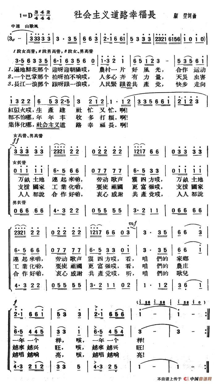 社会主义道路幸福长合唱谱该歌谱演奏者为顾翌,歌曲名称为社会主义道路幸福长,歌谱类型为合唱谱。指集体演唱多声部声乐作品的艺术门类,常有指挥,可有伴奏或无伴奏。它要求单一声部音的高度统一,要求声部之间旋律的和谐,是普及性最强、参与面最广的音乐演出形式之一。人声作为合唱艺术的表现工具,有着其独特的优越性,能够最直接地表达音乐作品中的思想情感,激发听众的情感共鸣。声部的数量没有规定,一般有四个声部。多为男高音区,男中低音区,女高音区,女中低音区。