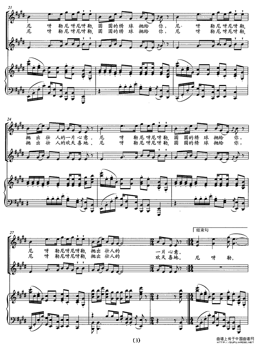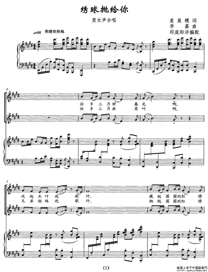 绣球抛给你(正谱)合唱谱该歌谱演奏者为李嘉 ,歌曲名称为绣球抛给你,歌谱类型为合唱谱。集体演唱多声部声乐作品的艺术门类,常有指挥,可有伴奏或无伴奏。它要求单一声部音的高度统一,要求声部之间旋律的和谐,是普及性最强、参与面最广的音乐演出形式之一。人声作为合唱艺术的表现工具,有着其独特的优越性,能够最直接地表达音乐作品中的思想情感,激发听众的情感共鸣。声部的数量没有规定,一般有四个声部。多为男高音区,男中低音区,女高音区,女中低音区