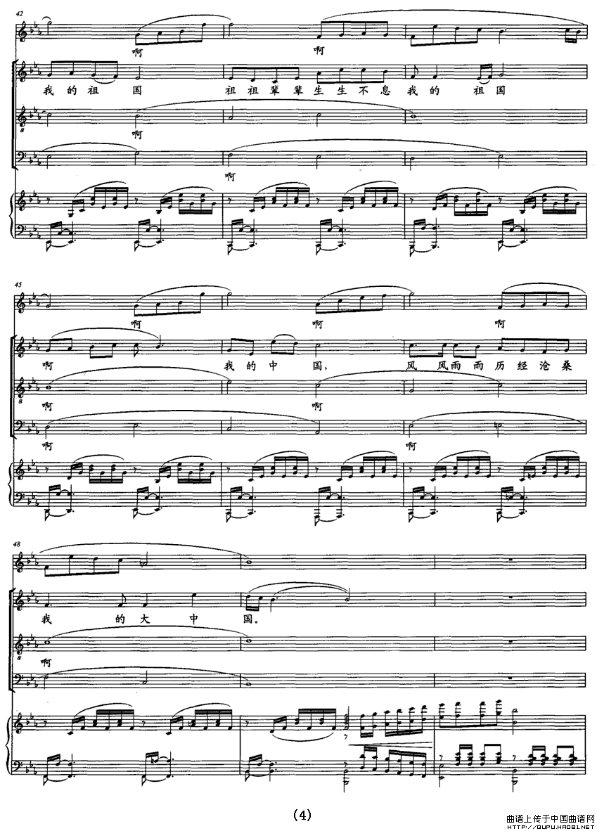 :精彩中国(巩建华词 孙厚存曲)合唱谱该歌谱演奏者为孙厚存,歌曲名称为精彩中国,歌谱类型为。指集体演唱多声部声乐作品的艺术门类,常有指挥,可有伴奏或无伴奏。它要求单一声部音的高度统一,要求声部之间旋律的和谐,是普及性最强、参与面最广的音乐演出形式之一。人声作为合唱艺术的表现工具,有着其独特的优越性,能够最直接地表达音乐作品中的思想情感,激发听众的情感共鸣。声部的数量没有规定,一般有四个声部。多为男高音区,男中低音区,女高音区,女中低音区。中国收获着精彩(邓成彬词 周维华曲)合唱谱