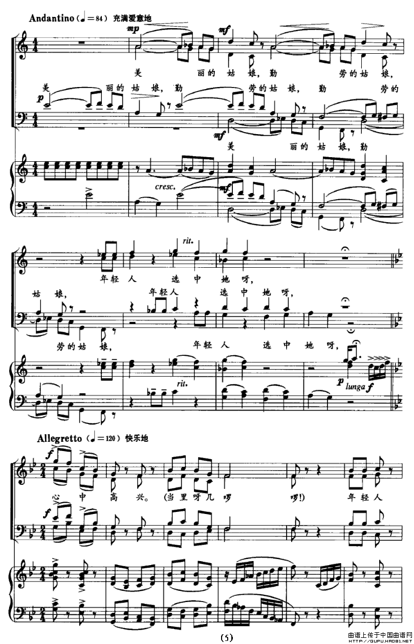 (4)混声合唱。由女声(或童声)与男声混合组织的合唱。前三种合唱均为同类人声组成,故亦称为同声合唱。同声合唱都有高音和低音两个基本声部。根据具体合唱歌曲的演唱需要,每个基本声部还可以分为第一、第二两个声部。
