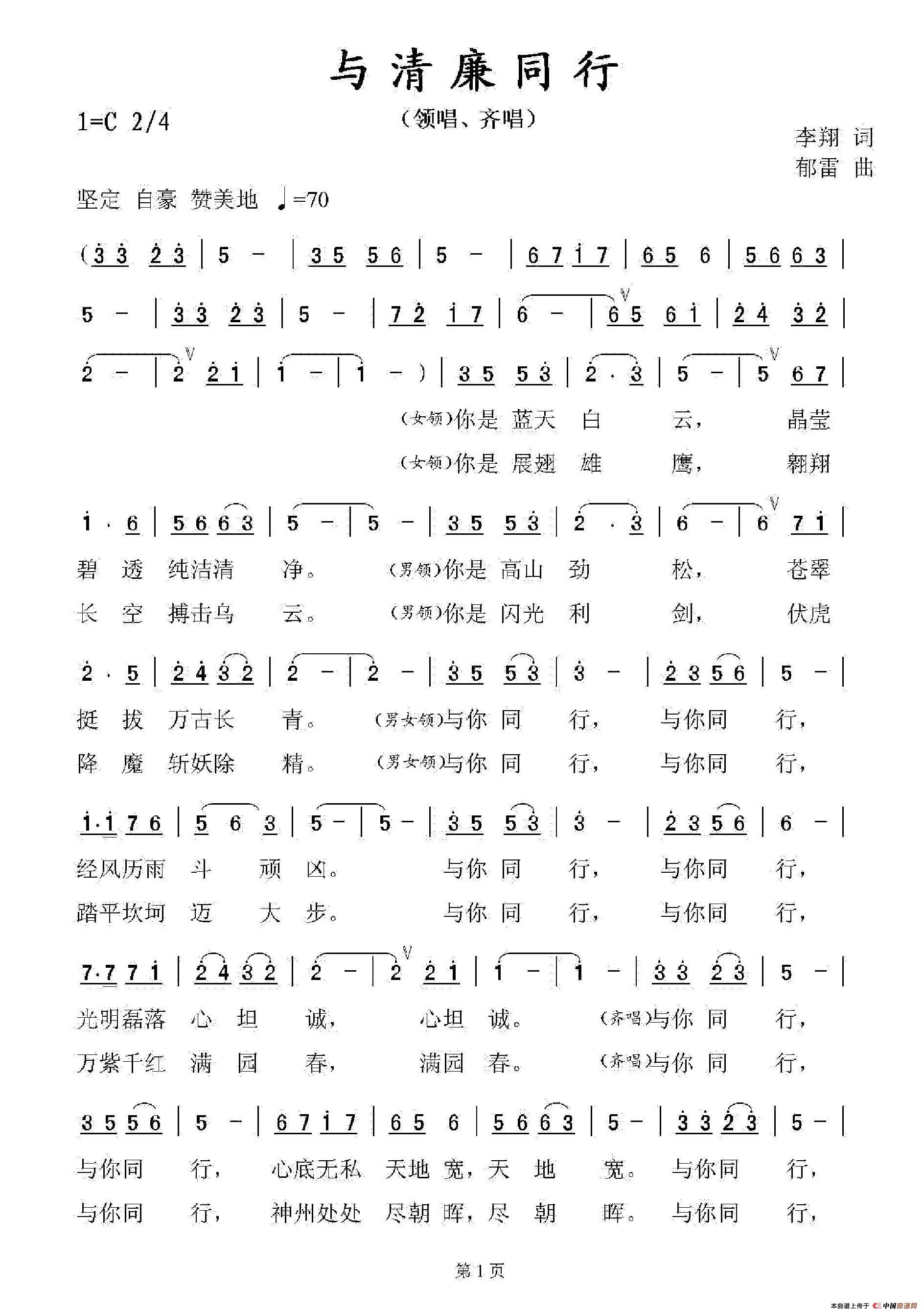 与清廉同行合唱谱